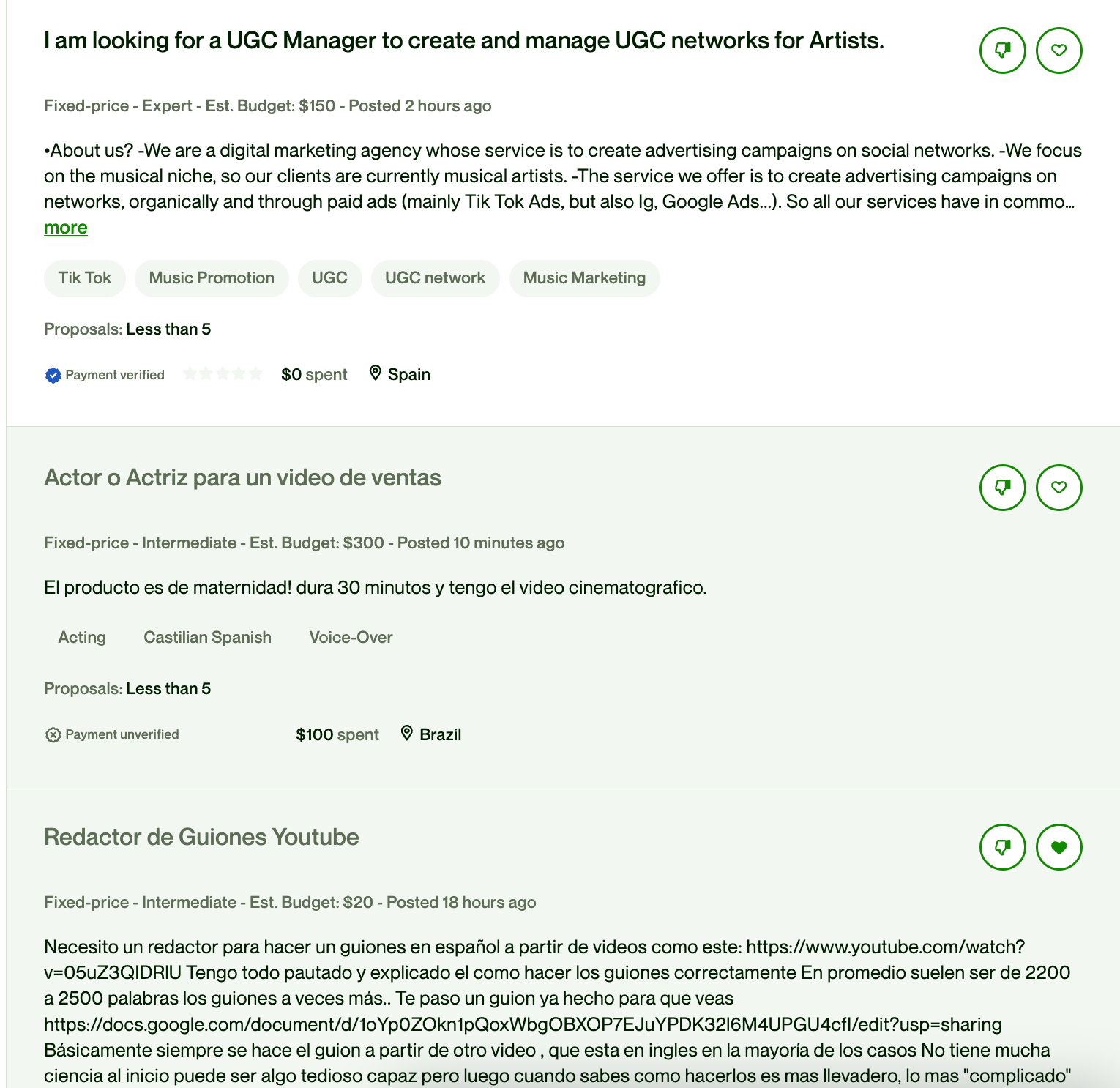 Upwork tiene de todo: desde ofertas buscando actrices, a otras donde solicita personas que graben textos en español.